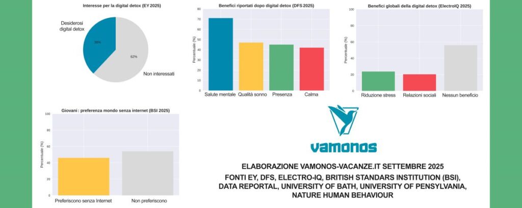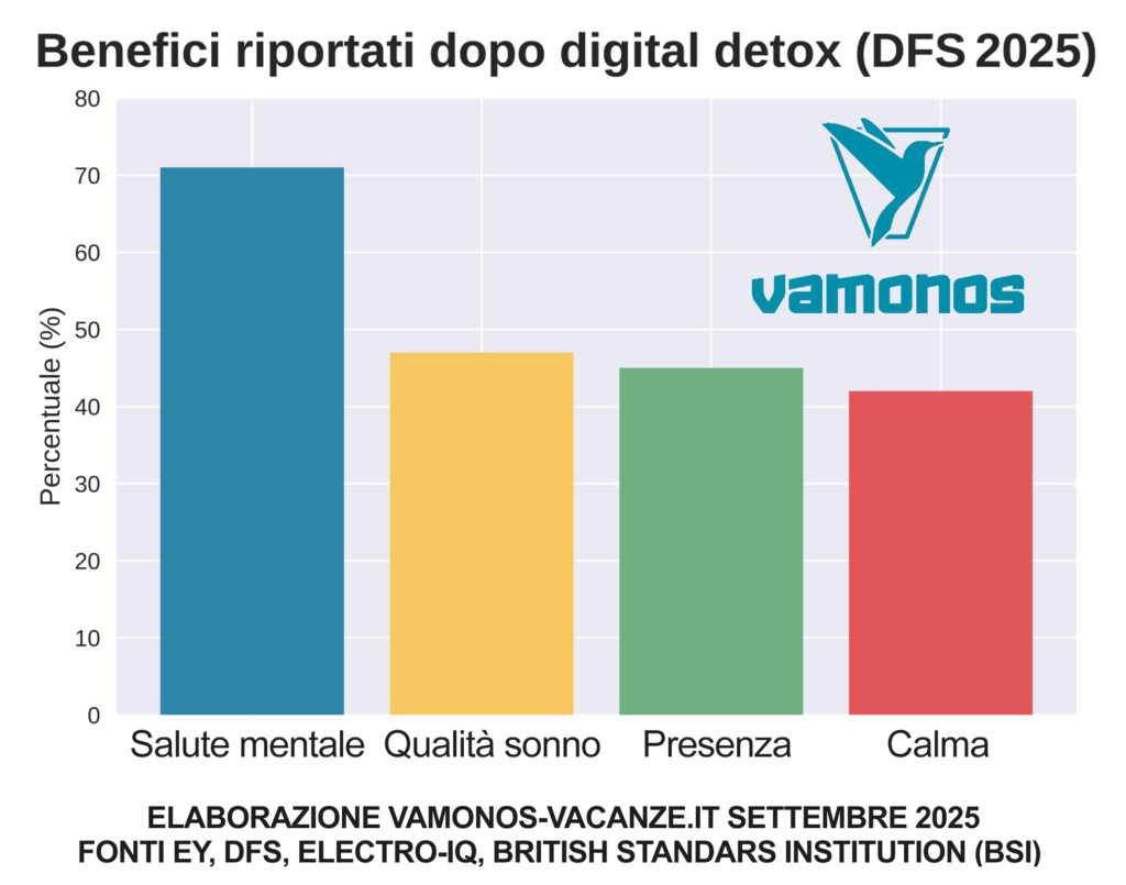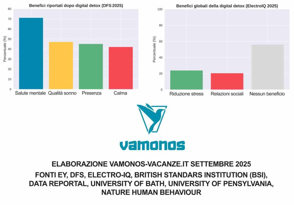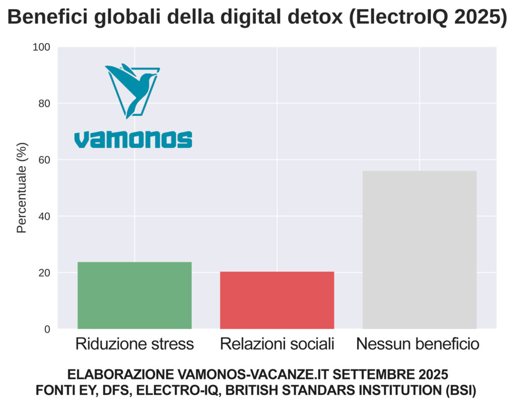 Poi ancora, Vamonos Vacanzesi fa portavoce diuna ricerca a più ampio raggio realizzata da Electro IQ, una piattaforma online che dal 2010 è un punto di riferimento per statistiche, dati e analisi relative ai settori della scienza e della tecnologia a livello globale. Questa ricerca rileva che il 23,7% delle persone —dopo una “digital detox”— sperimenta una riduzione di stress e ansia e che il 20,3% migliora anche le sue relazioni sociali.