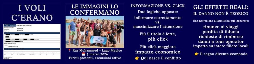A fronte della rappresentazione mediatica che coinvolge gran parte della stampa mainstream, emergono elementi documentali che indicano una realtà diversa. Secondo i dati forniti da Vamonos Vacanze, risultano partenze regolari con voli Air Cairo da Roma, Milano, Bologna e Napoli.